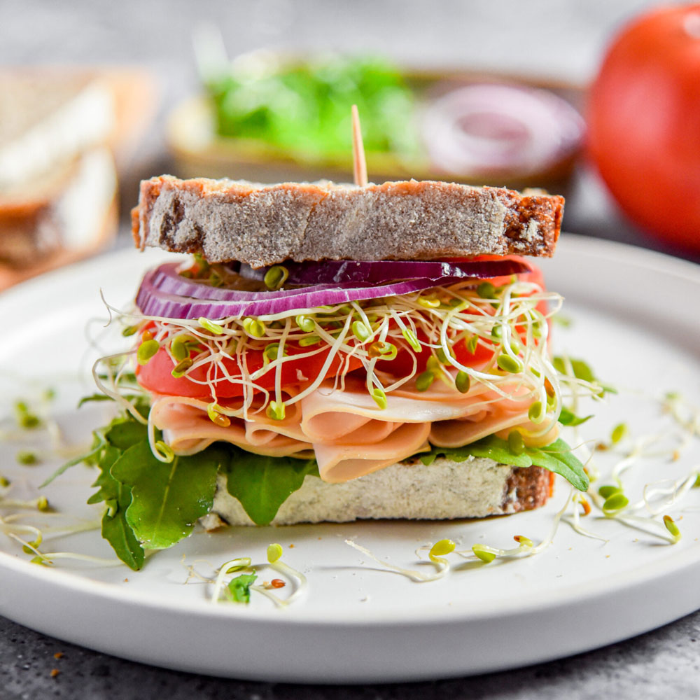● Chleb polać oliwą i nałożyć na niego rukolę, szynkę, pomidora, cebulę i kiełki.
