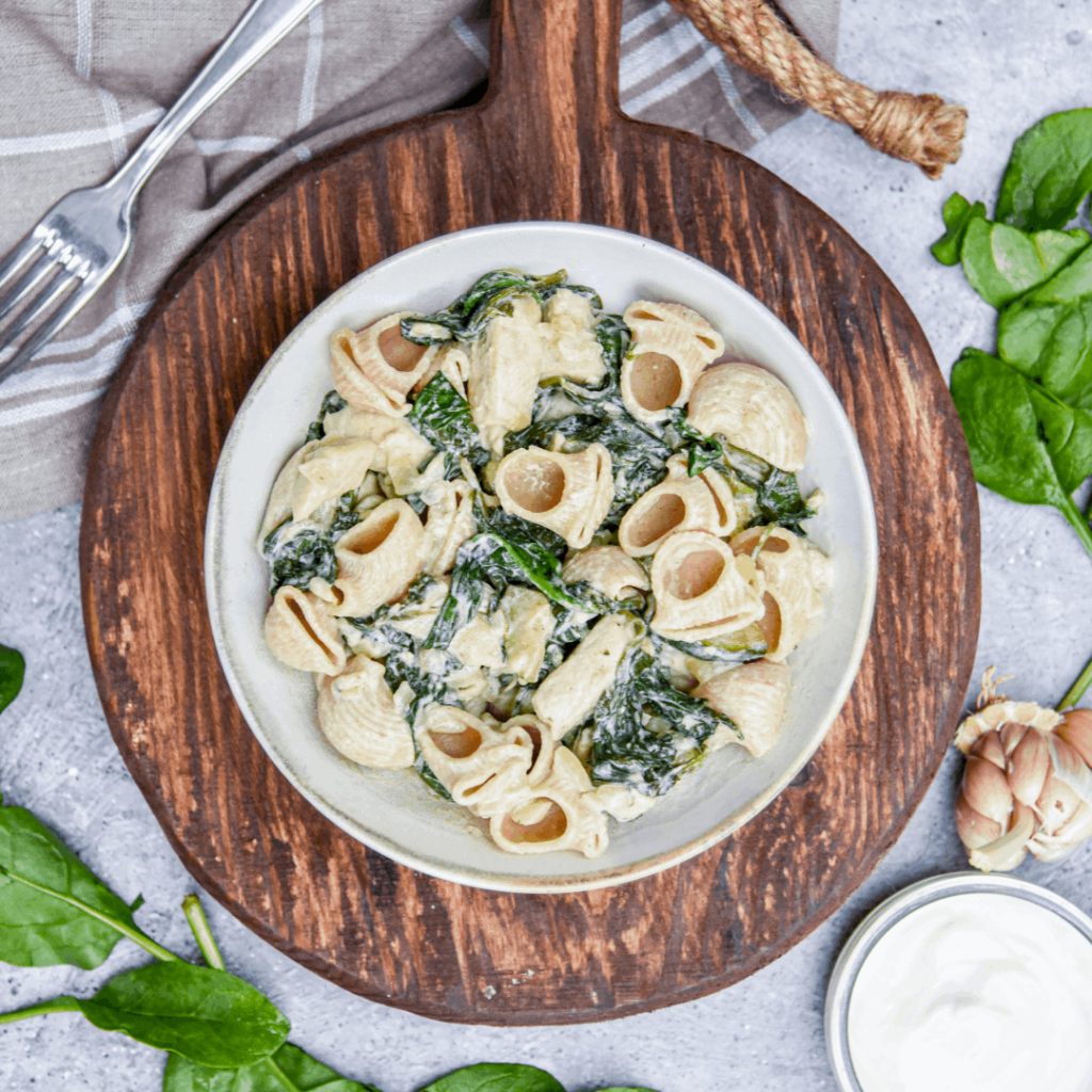 6. Dodać na patelnię skyr i całość dokładnie wymieszać. Podgrzewać do zgęstnienia sosu.