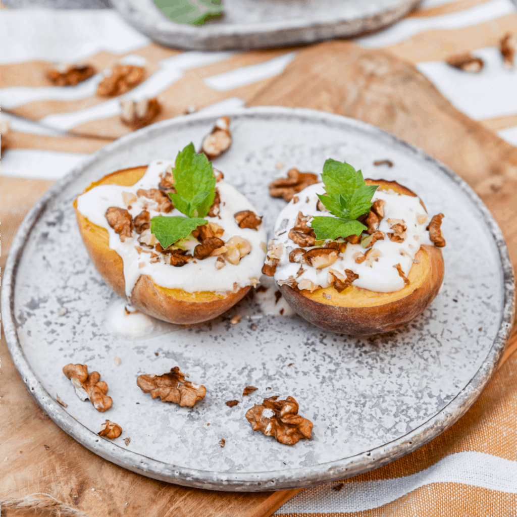 3. Upieczone brzoskwinie podawać z jogurtem, posiekanymi migdałami i miętą.