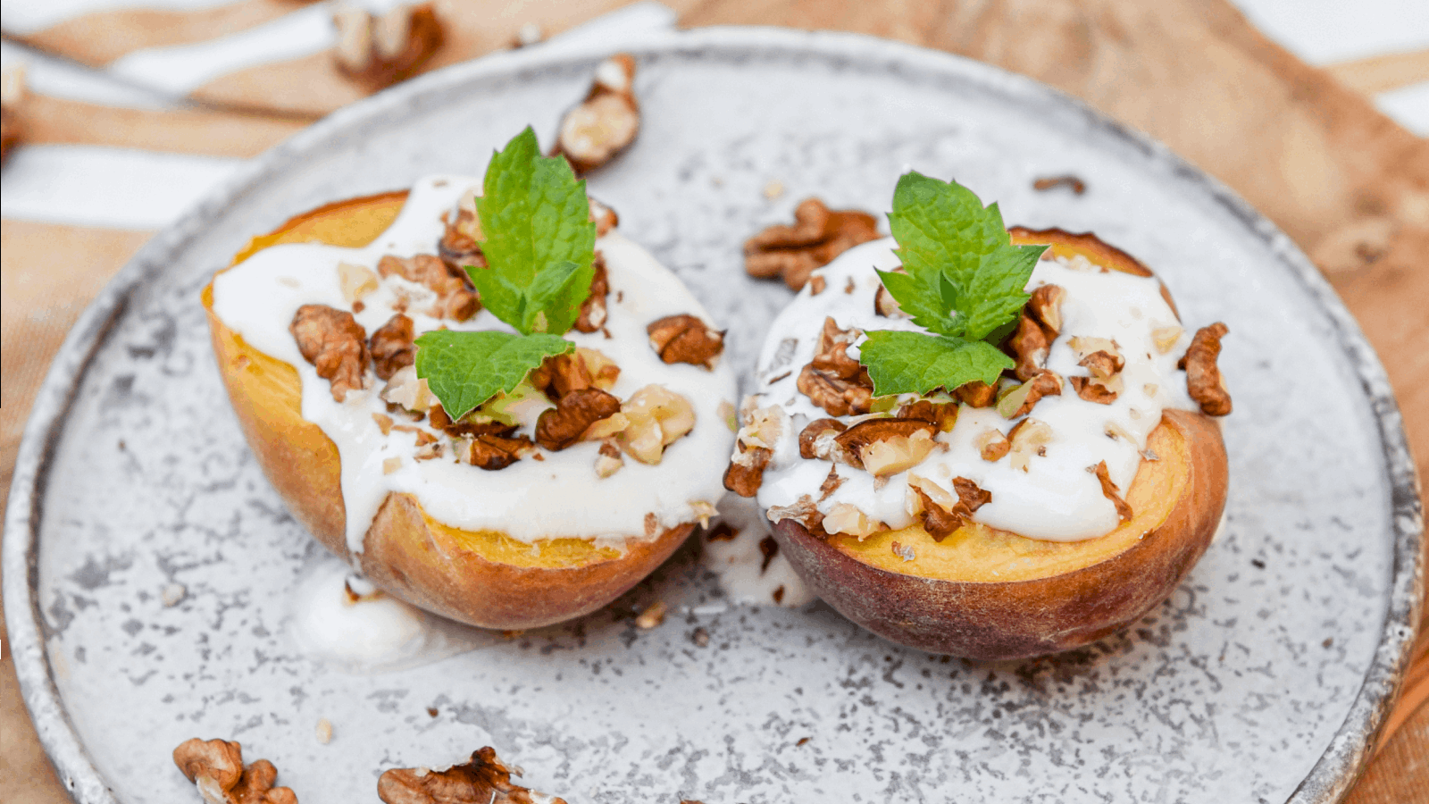 3. Upieczone brzoskwinie podawać z jogurtem, posiekanymi migdałami i miętą.