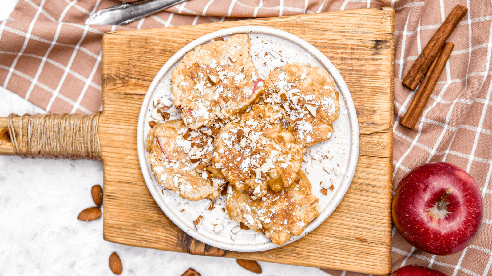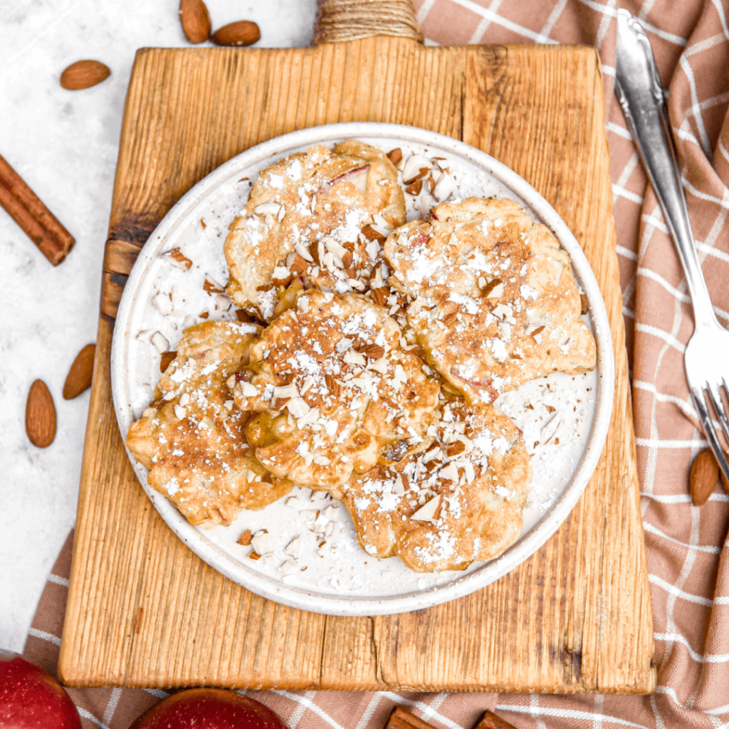 4. Gotowe placuszki podawać z posiekanymi migdałami. Opcjonalnie można je też posypać pudrem z erytrytolu.